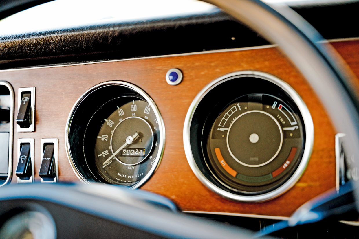 Wooden inlays add a touch of glamour to the Austin’s shallow, slender dashboard (left); the R16’s wood-capped strip speedo is very much of its time