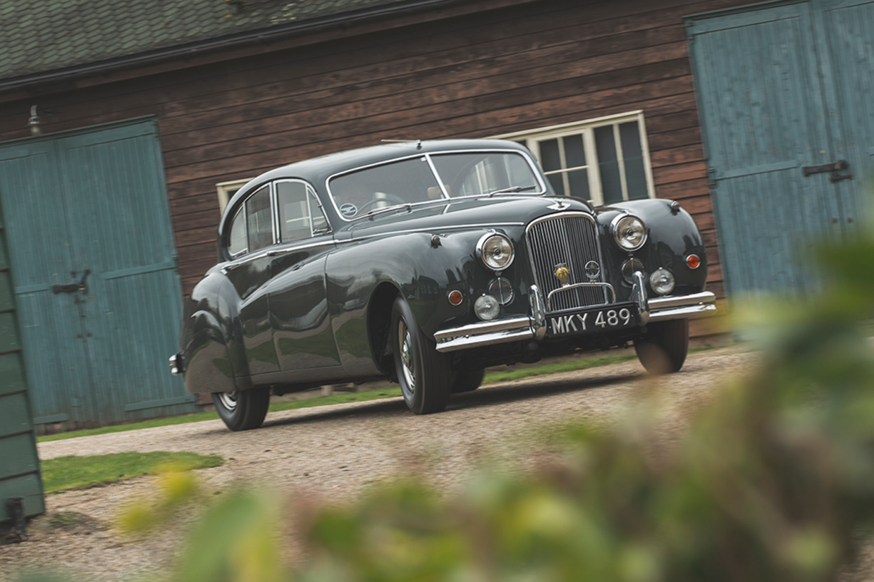 The ‘M’ was Jaguar’s first revision of the big saloon from September 1954, still with the divided windscreen but identifiable by its wing-mounted indicators and foglights placed on the bumpers of a simplified cross-section and which also wrapped around more at the rear.