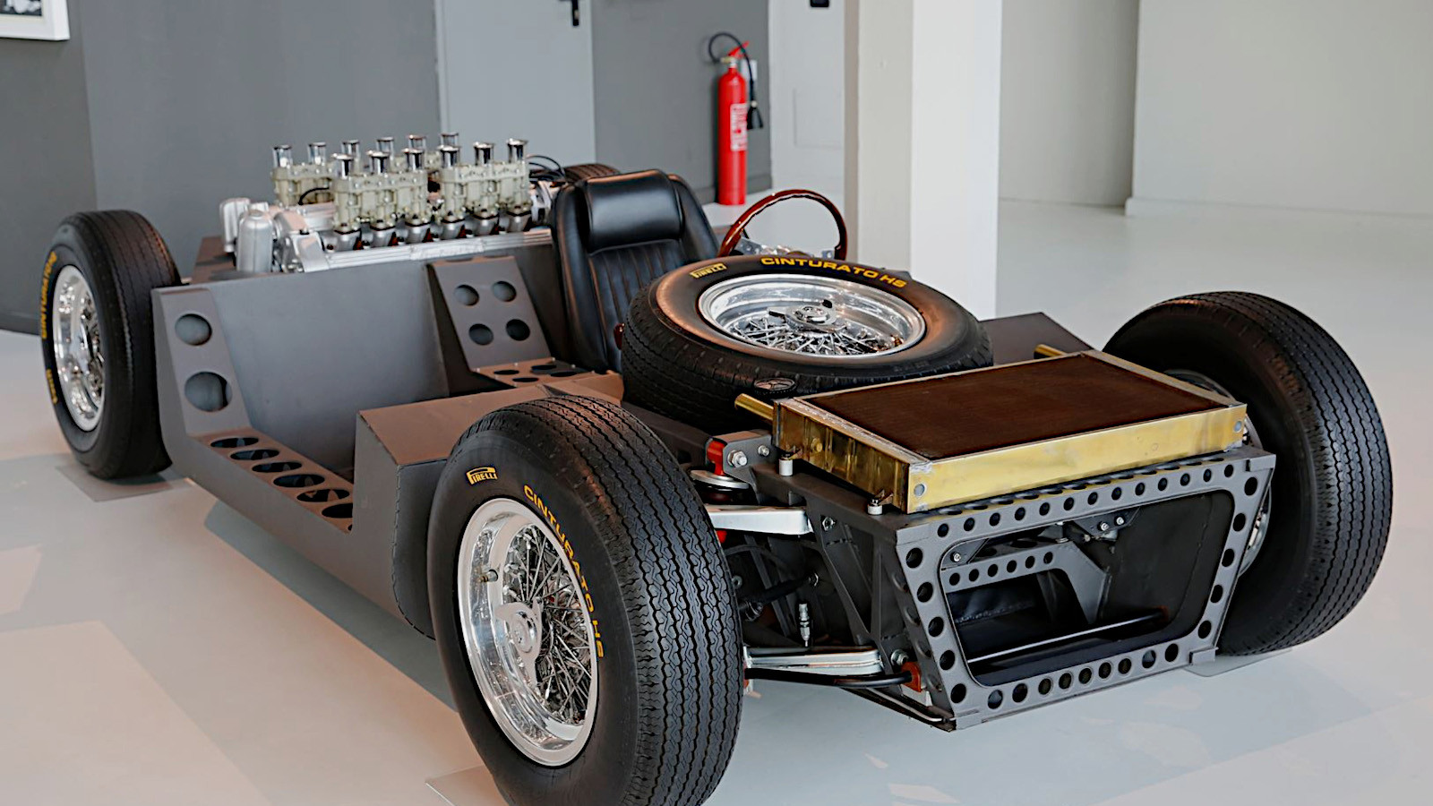 At this point it was still basically a chassis, but now with double-wishbone suspension, Girling disc brakes, Borrani wire wheels and a drivetrain added.