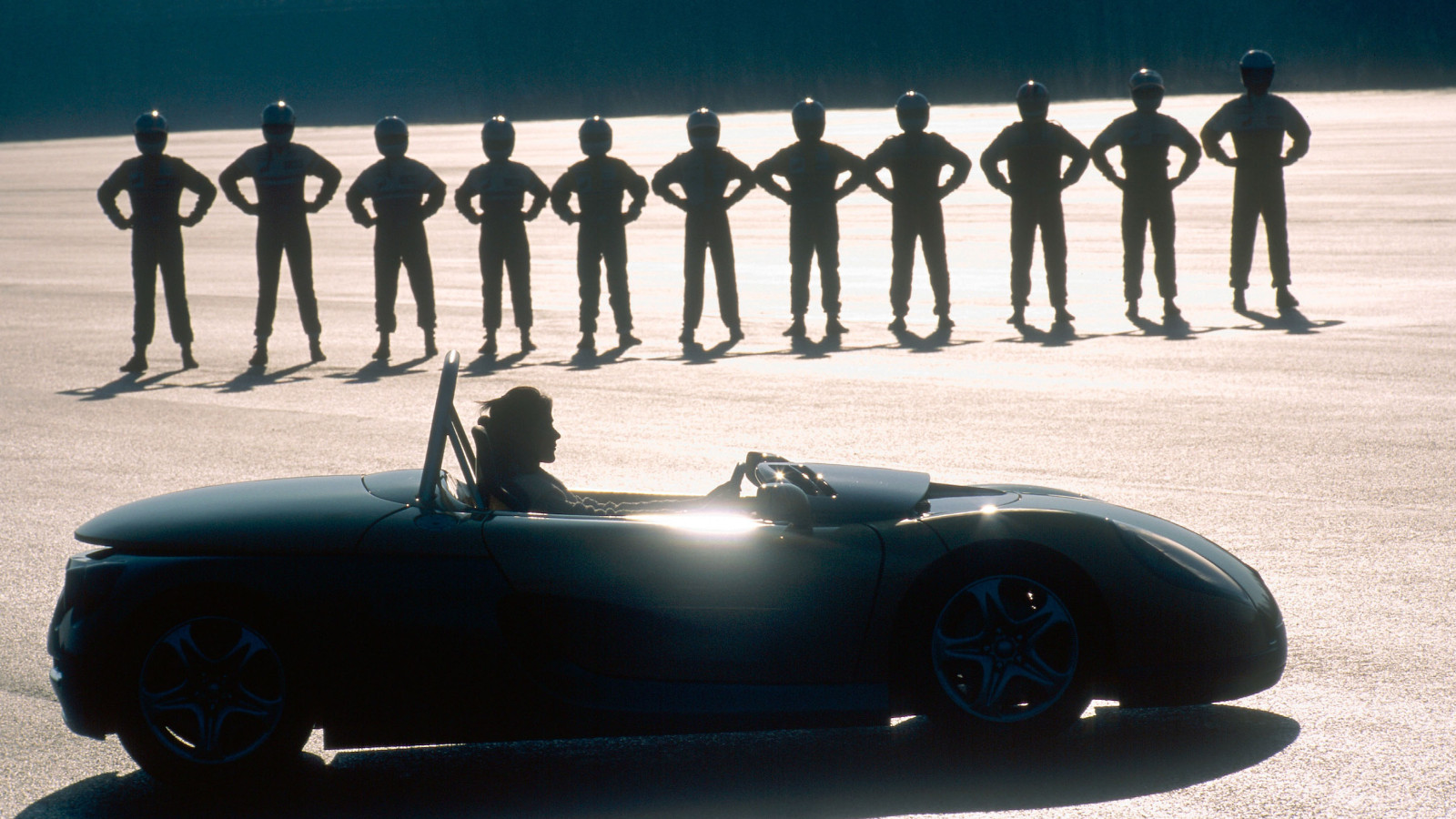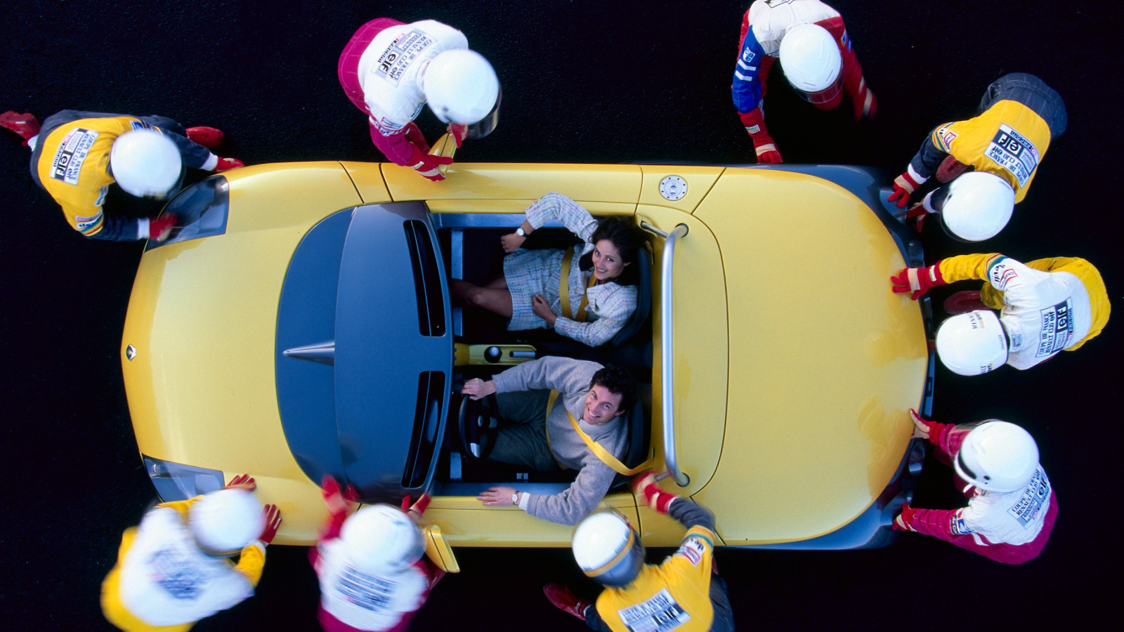 A stone-cold favorite in the press shot archive. I mean, what better way to illustrate your brand-new sports car than with what looks like a gang of marauding Power Rangers following the seemingly oblivious young couple at the heart of the advert?