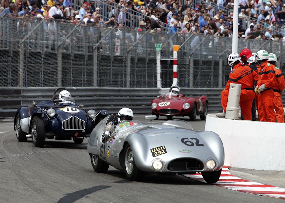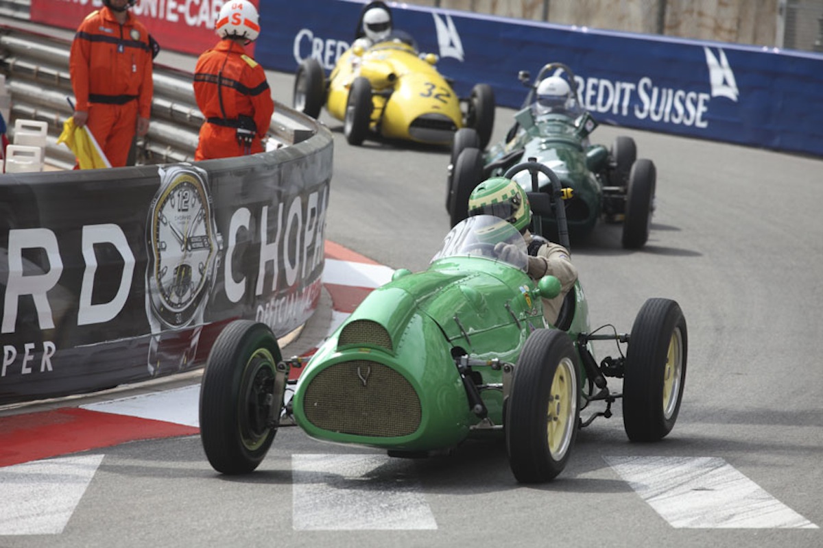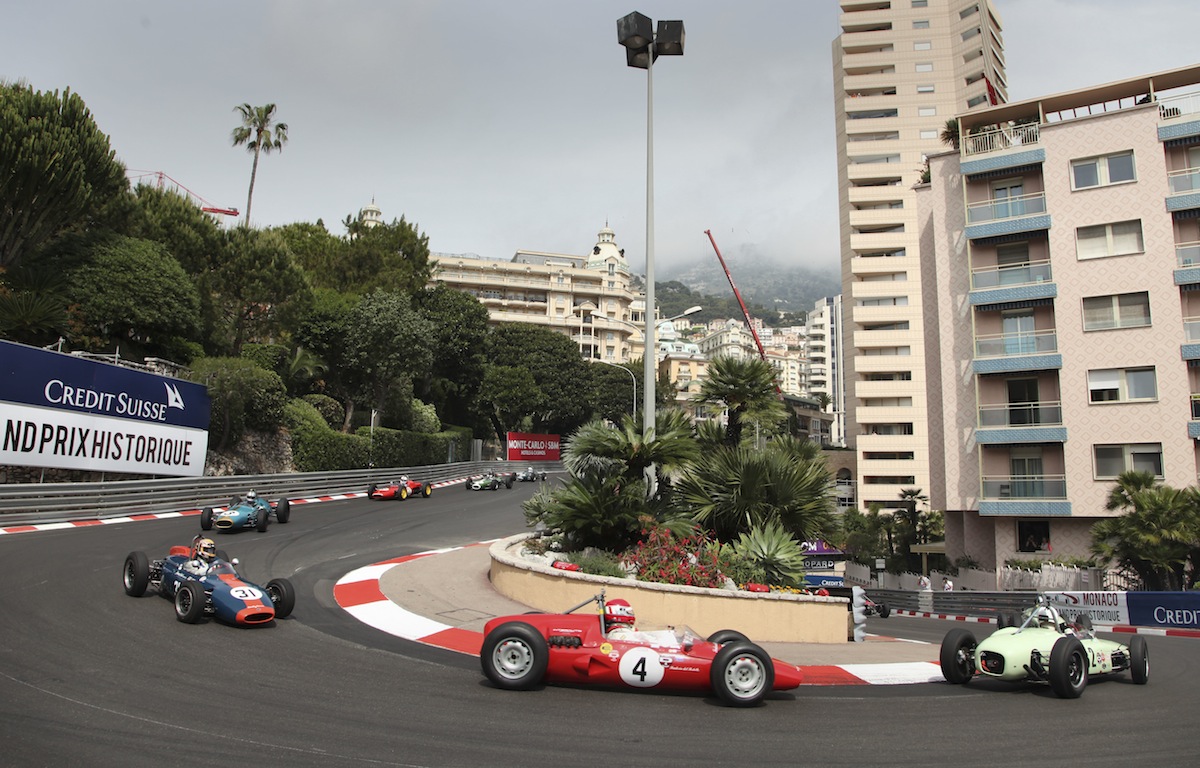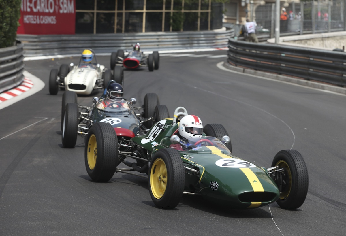 Lotus cars always fared well in Monaco, in period and now in historic racing, and made up nearly half the pre-'61 grid. Here Peter Studer's 24 leads the Lola MkIV of 'Mister John of B' and John Elliott's Lotus 18.