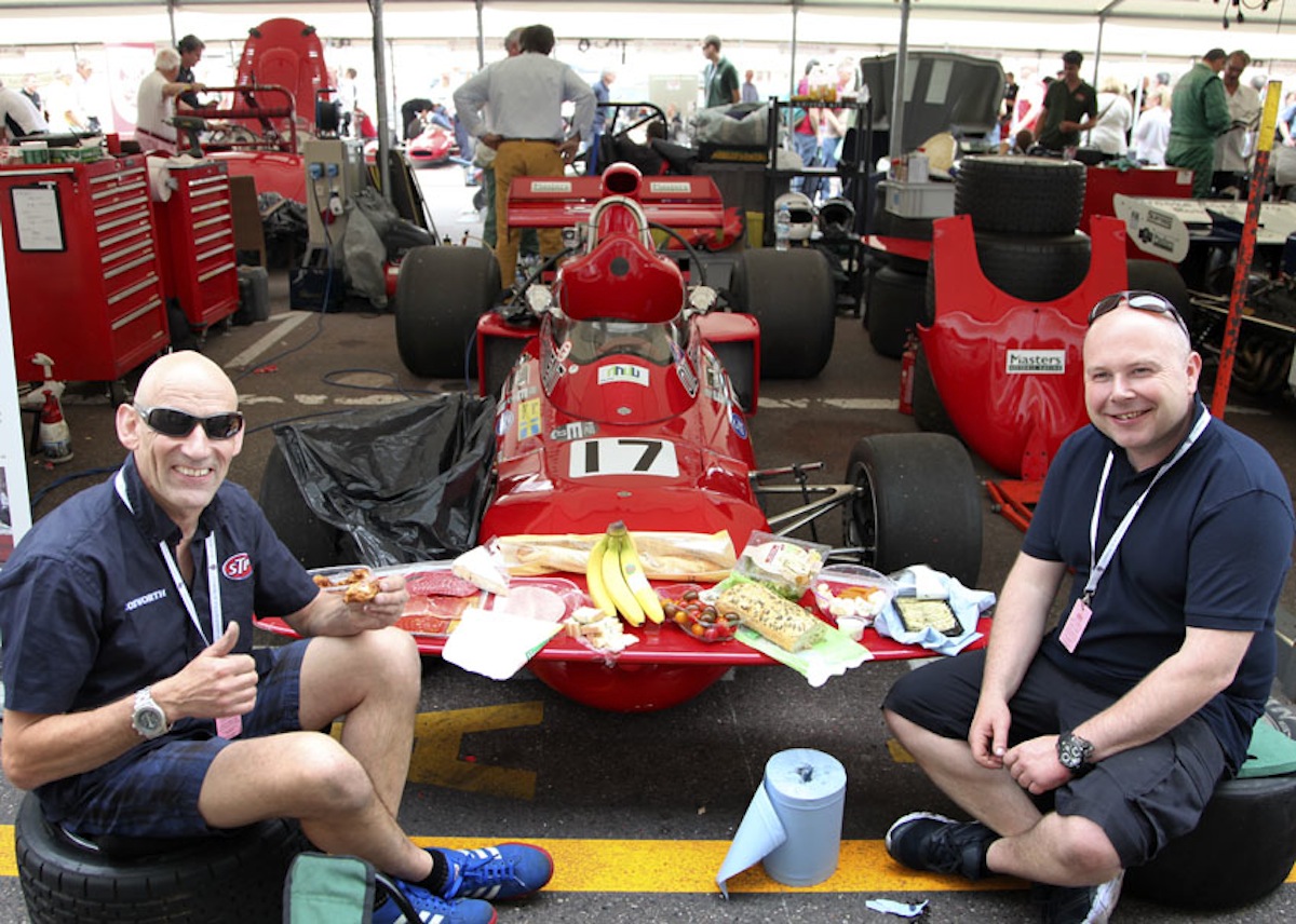 An inspired ad hoc picnic table in the paddock as Mike Wrigley's crew tuck into lunch putting the distinctive front wing of the March 711 to good use.