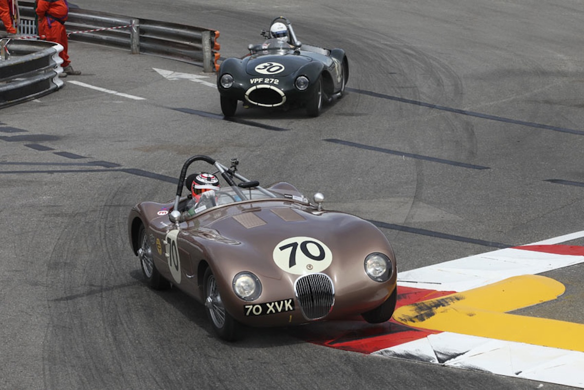 Alex Buncombe was unassailable around Monaco in the JD Classics-run Jaguar Heritage Racing Jaguar C-type. Here he is followed by Paul Griffin in the Connaught ALSR.