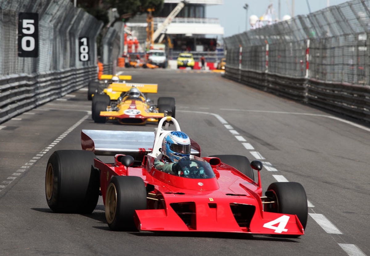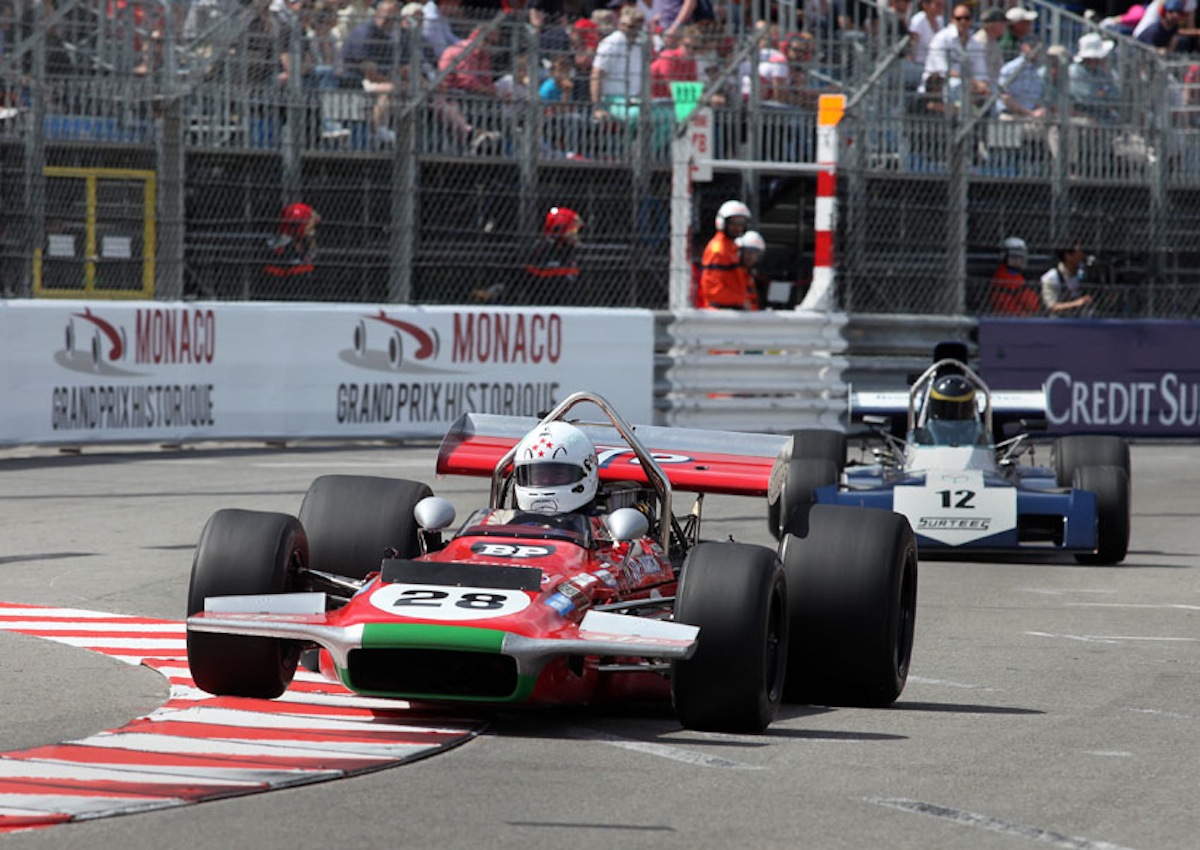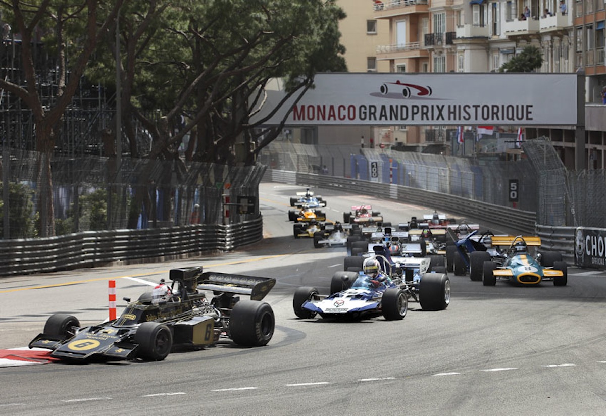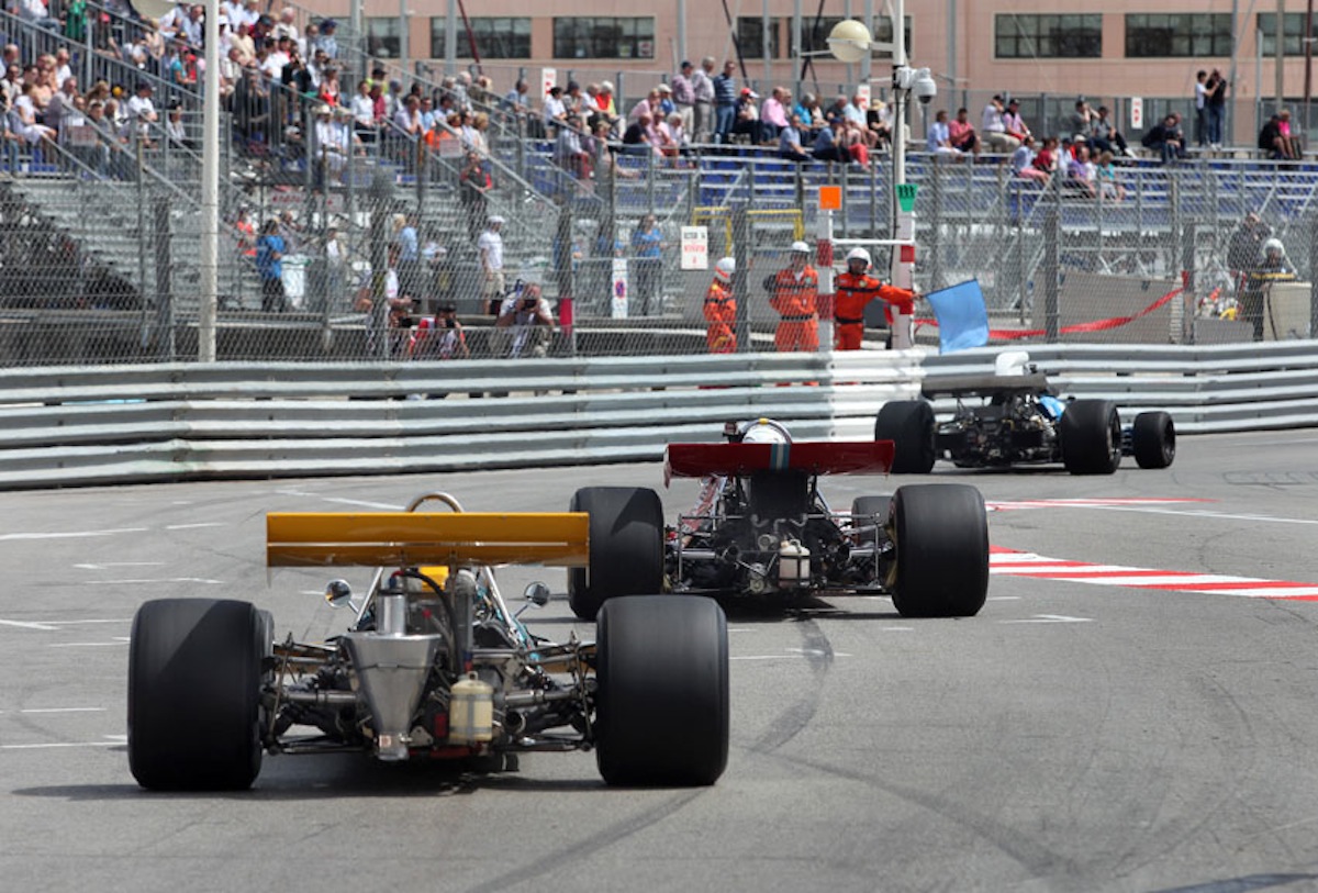 Eventual winner Katsu Kubota leads the superb grid of 1966-'72 F1 cars into Ste Dévote at the end of the start-finish straight. Behind the japanese driver are a Surtees TS9 and Brabham BT33.