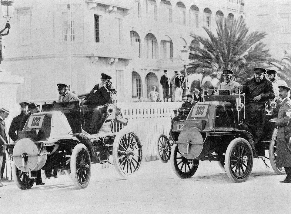 Nice Week, April 1903. At the start of the Nice–La Turbie hill climb on 1 April 1903: the subsequent winner, Otto Hieronimus, in a Mercedes-Simplex 60 HP. Standing in front of the car on the left is Adolf Spitz, while Ferdinand Porsche is at the rear wheel.