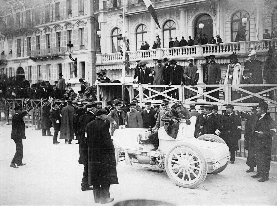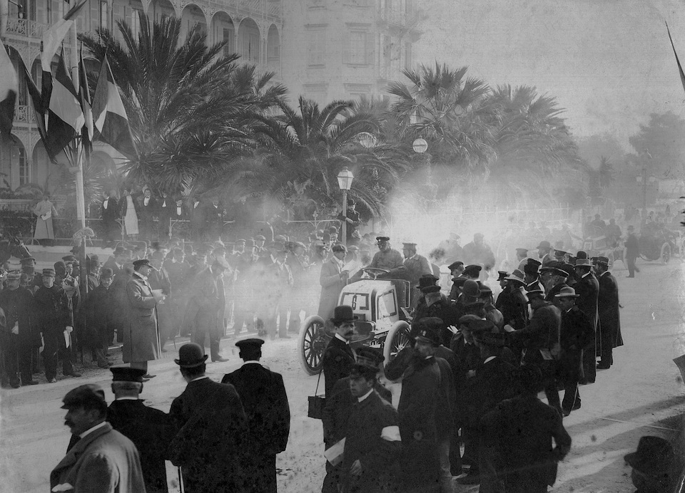 Nice Week in March 1900, start of the Nice–Marseilles race. A Daimler 23 HP “Phoenix” racing car outside the Hotel des Anglais on the Promenade des Anglais