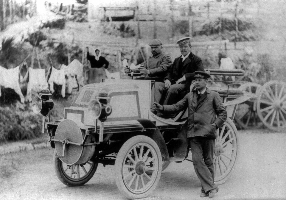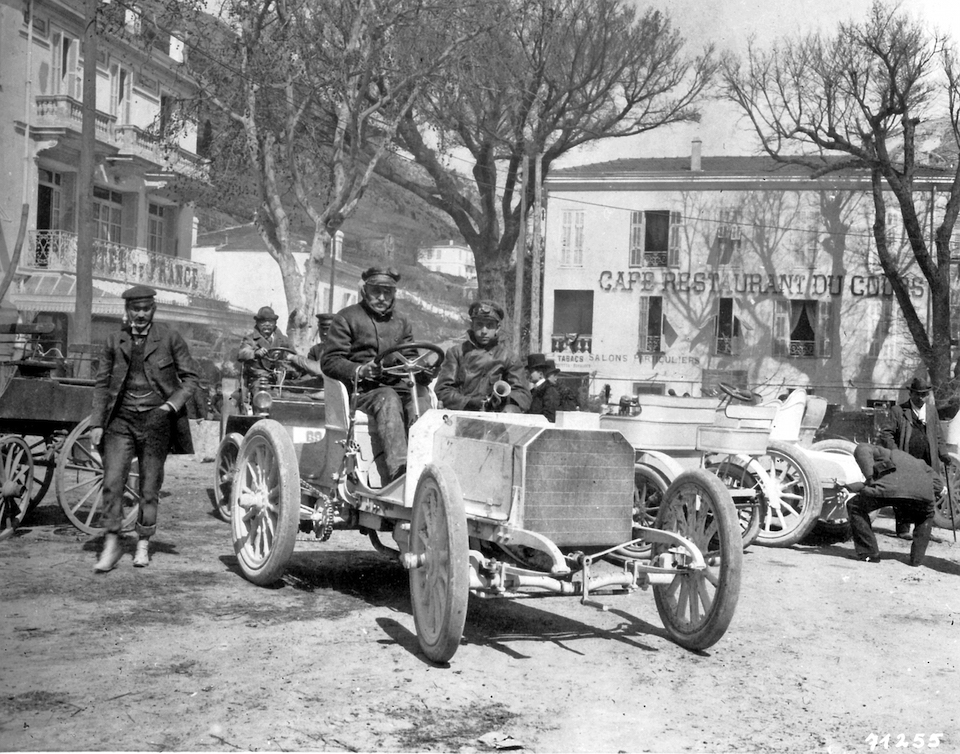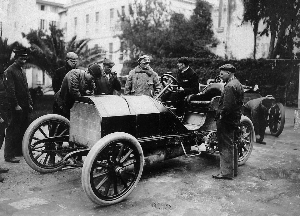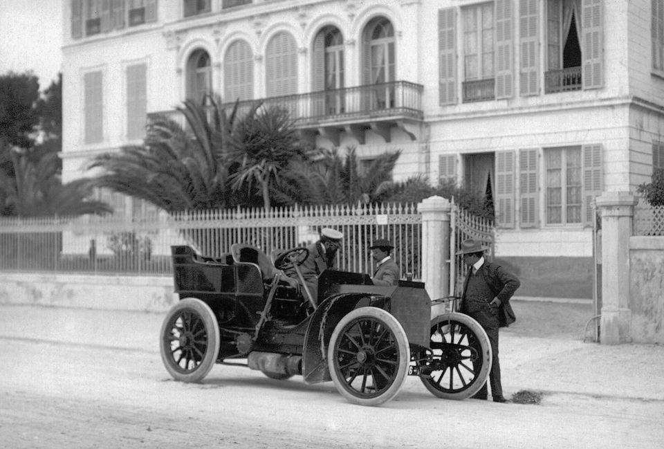 Nice Week, 25 to 29 March 1901. Baron Henri de Rothschild’s Mercedes 35 HP racing car in La Turbie after winning the Nice–La Turbie hill climb on 29 March 1901. At the wheel is Wilhelm Werner, who later became the German emperor’s driver.