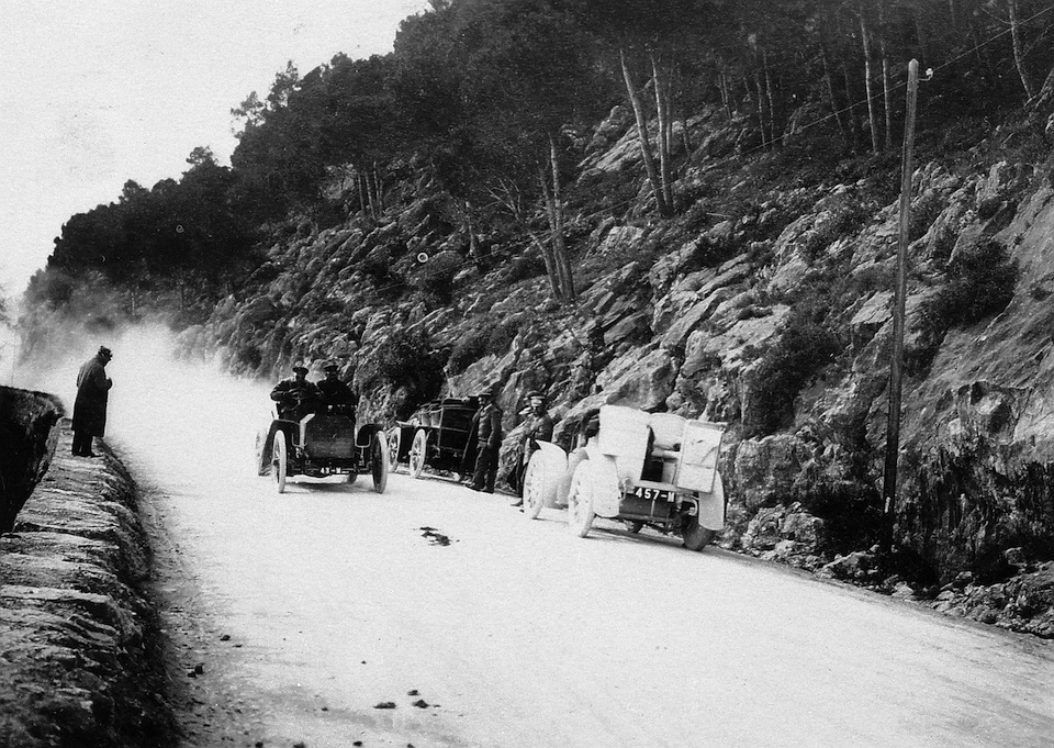 The Mercedes-Simplex 40 HP owned by Henri de Rothschild (alias “Dr. Pascal”) during testing on the stretch from Nice to La Turbie in March 1902.