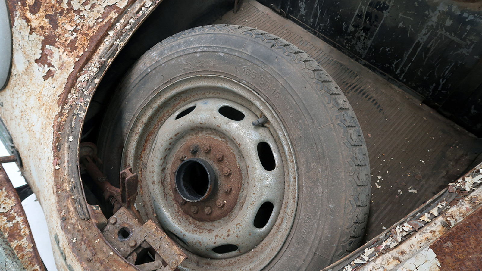 The spare wheel seems to be a match for the Rudge knock-offs fitted to the car, but there’s no sign of the original toolkit.