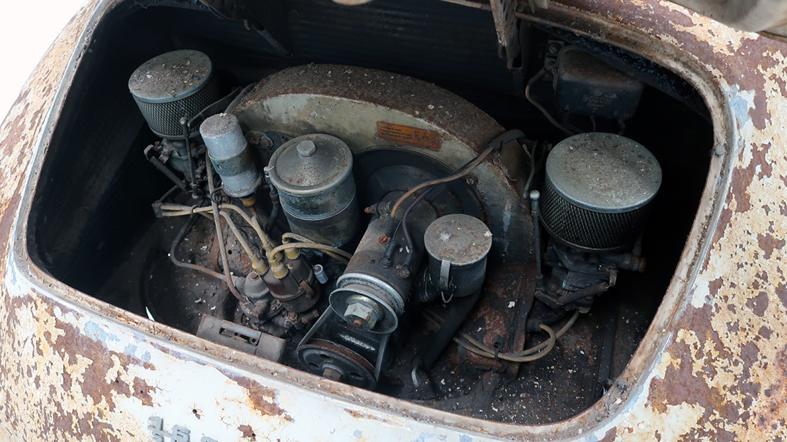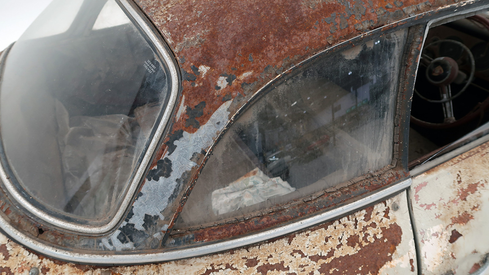 Despite being in rough condition with a torn steering wheel and rusting dashboard, the interior of the 356 is largely original and all complete.