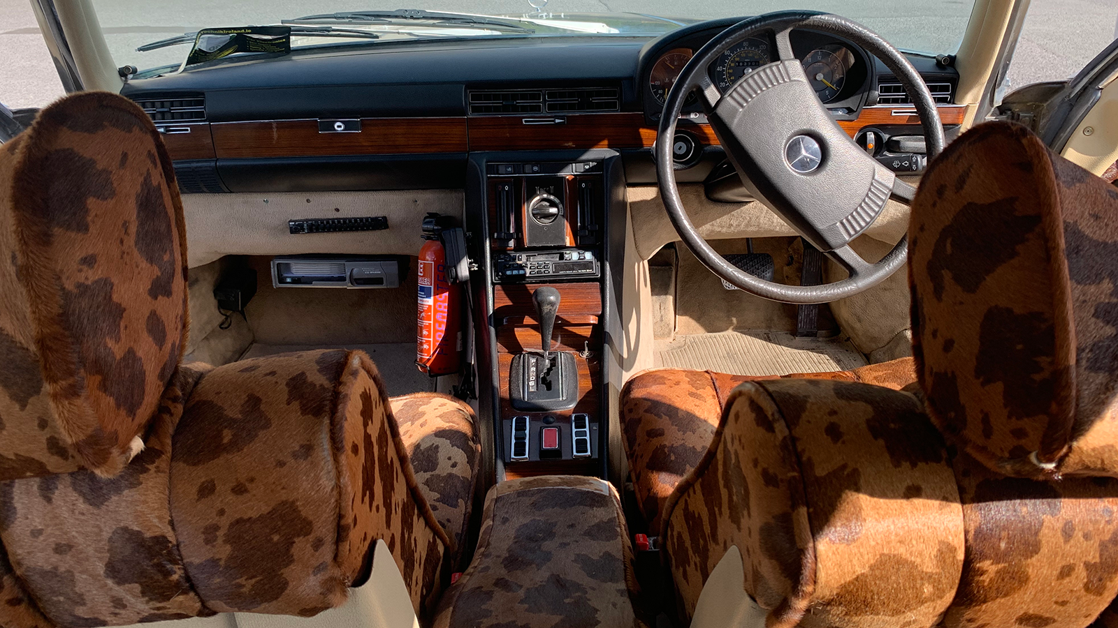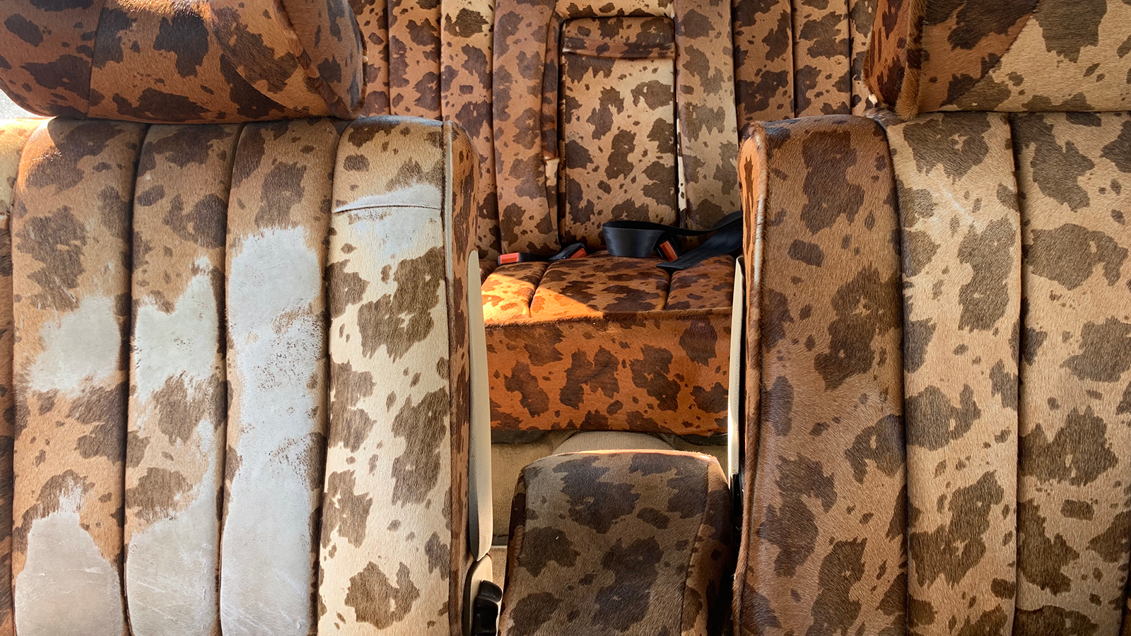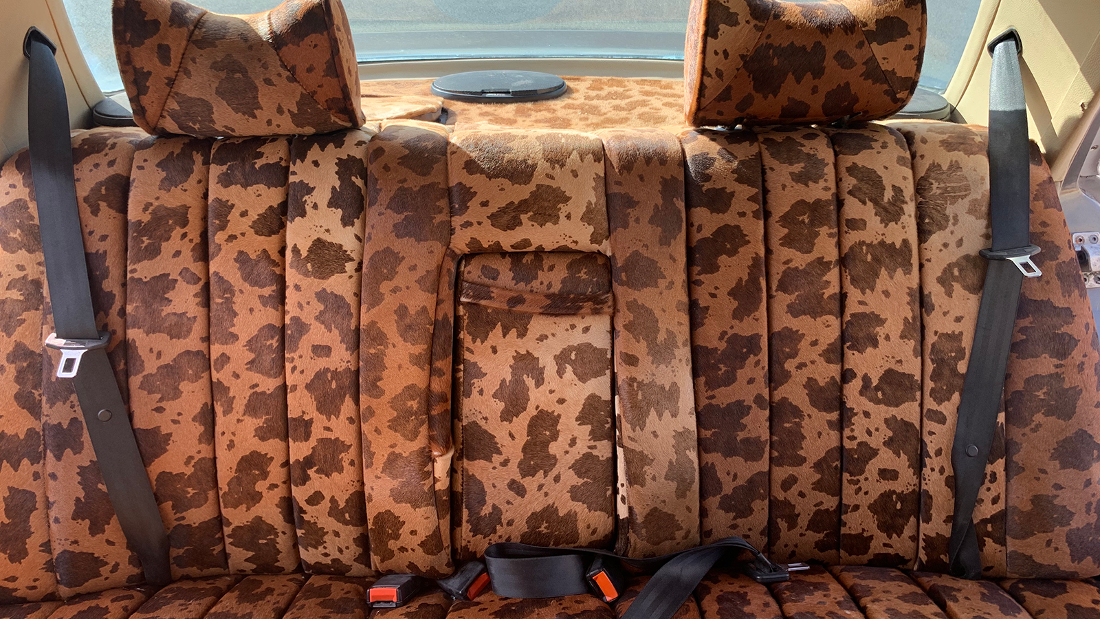 Apologies if your eyes are protesting. Quite sudden, isn’t it? It is not clear when the interior was retrimmed in this cow-hide pattern, which covers the seats, headrests, door cards and parcel shelf, and, rather like the rest of the car, it does show its age in places.