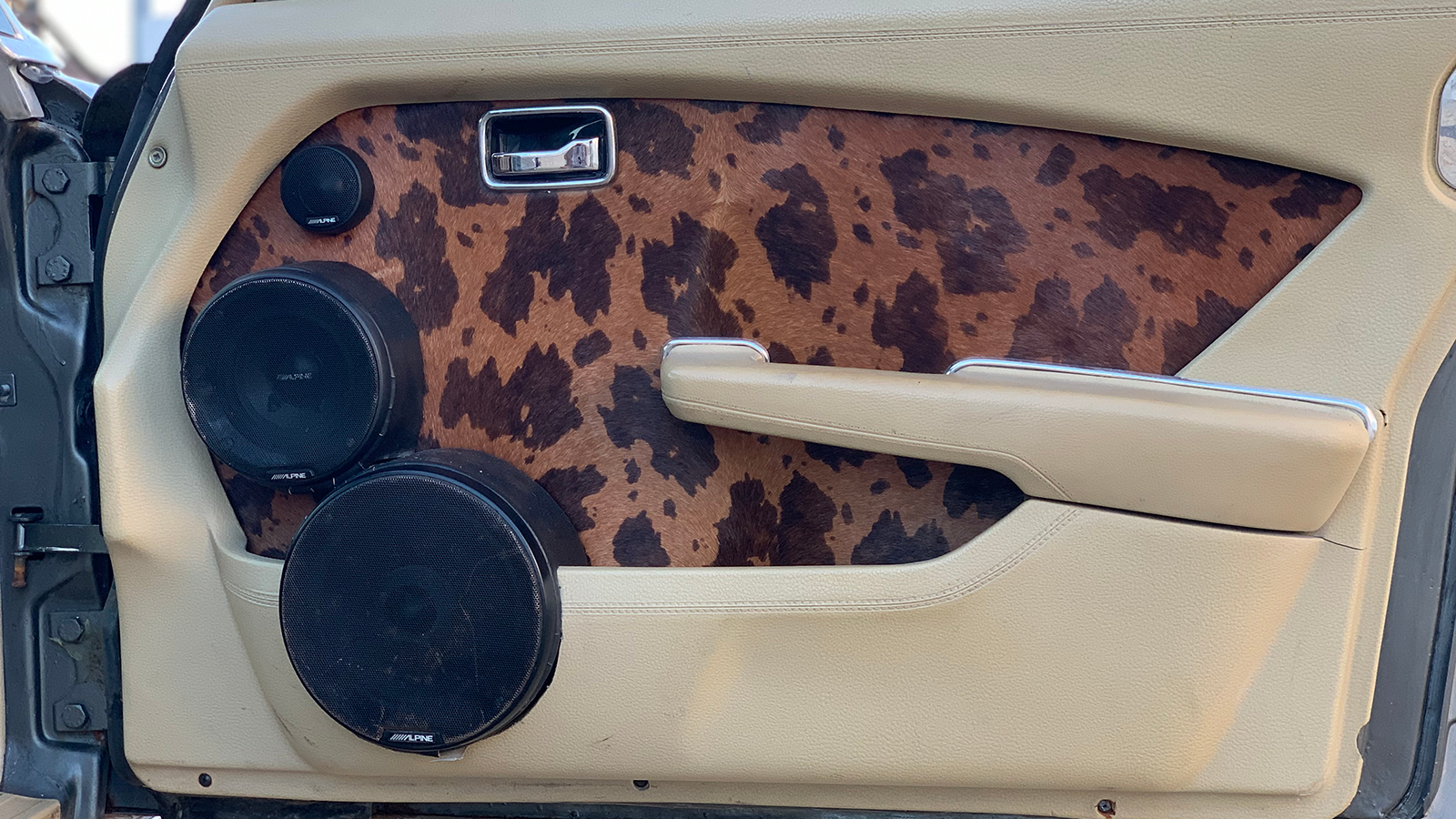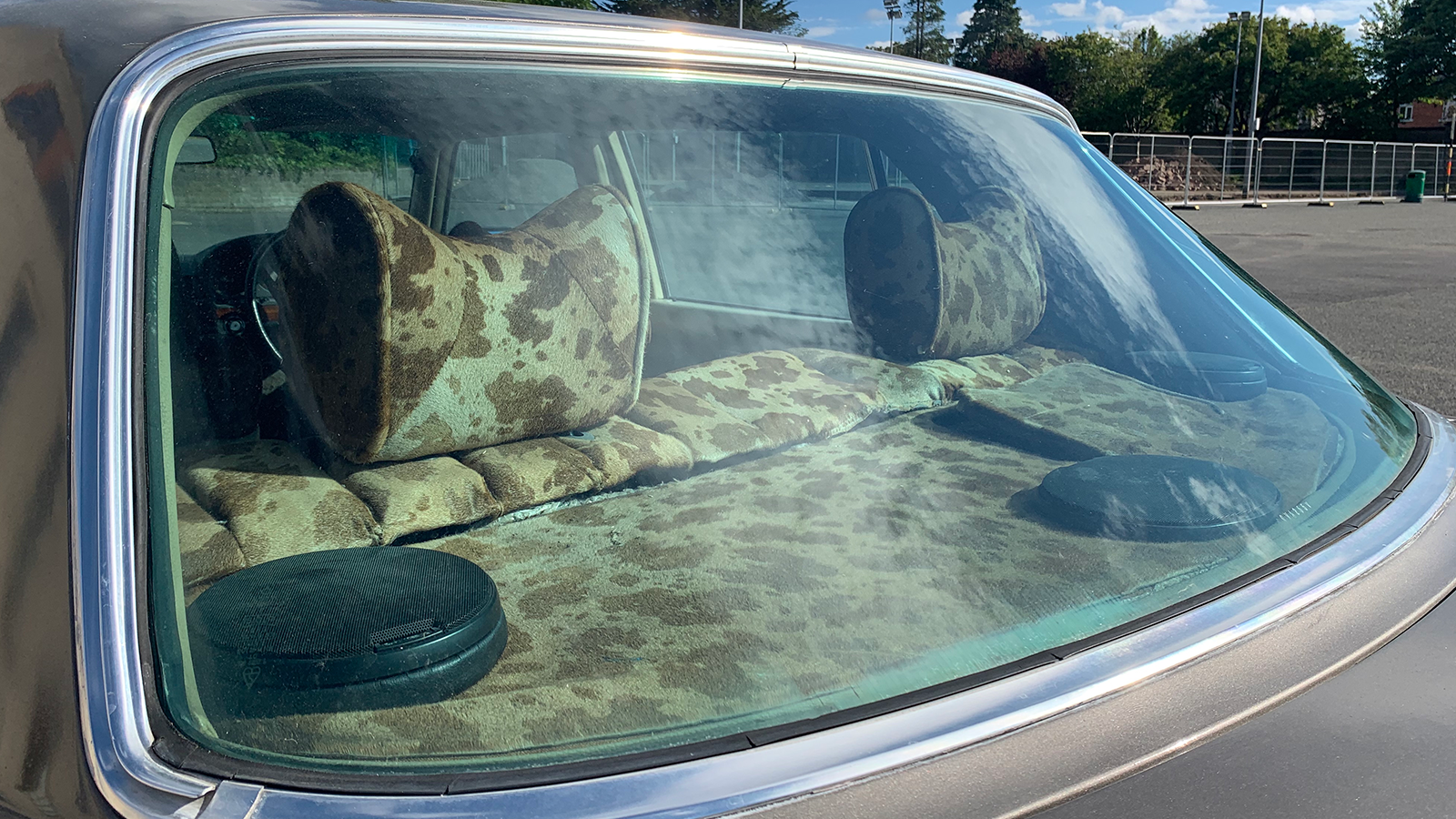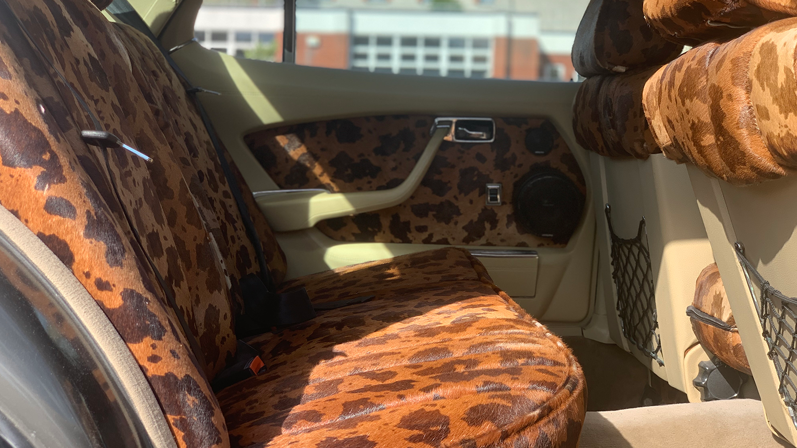 Apologies if your eyes are protesting. Quite sudden, isn’t it? It is not clear when the interior was retrimmed in this cow-hide pattern, which covers the seats, headrests, door cards and parcel shelf, and, rather like the rest of the car, it does show its age in places.