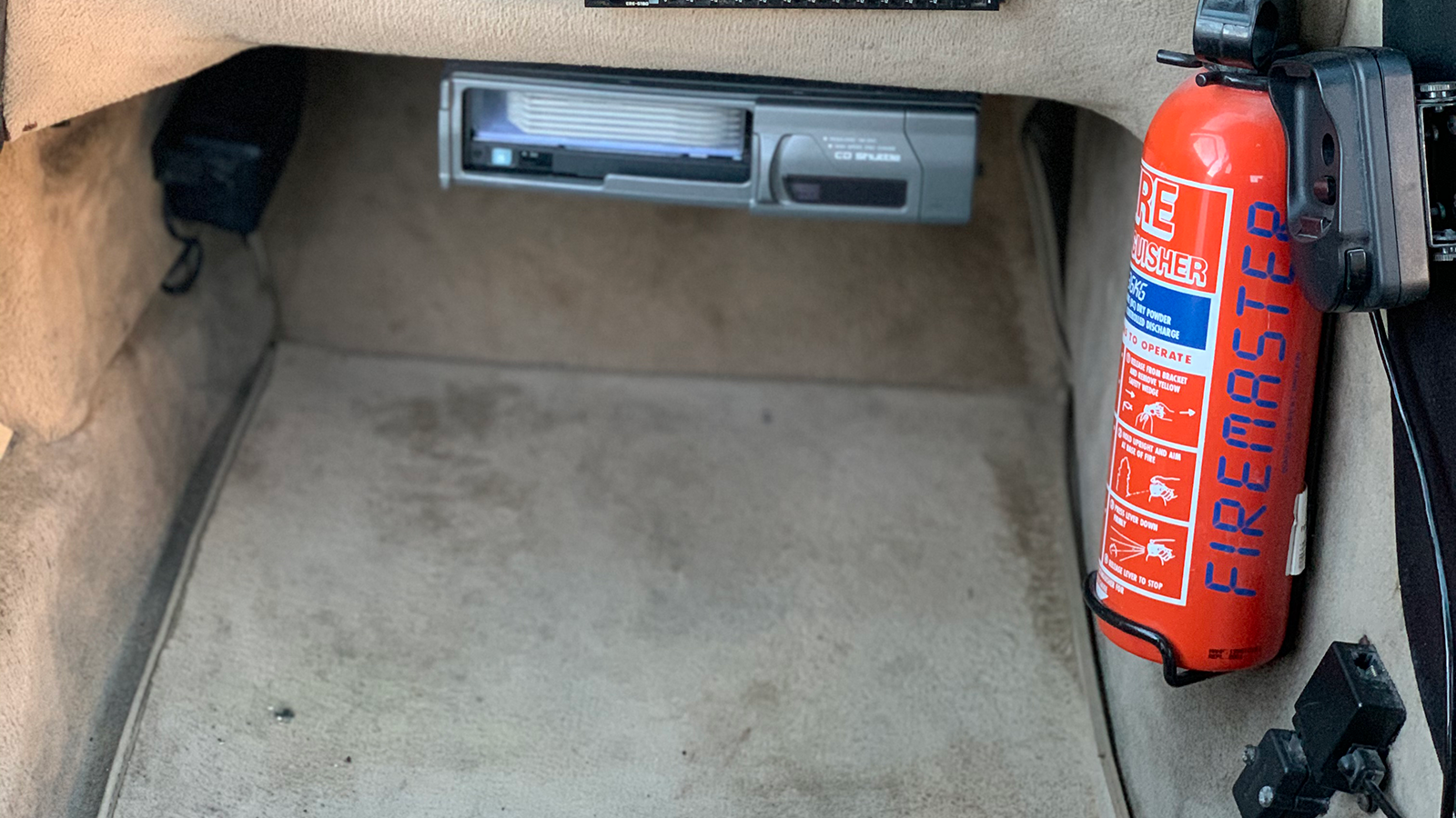 Bono also had to equip the car with this fire extinguisher, which you can see here in the passenger-side footwell, with the CD changer.