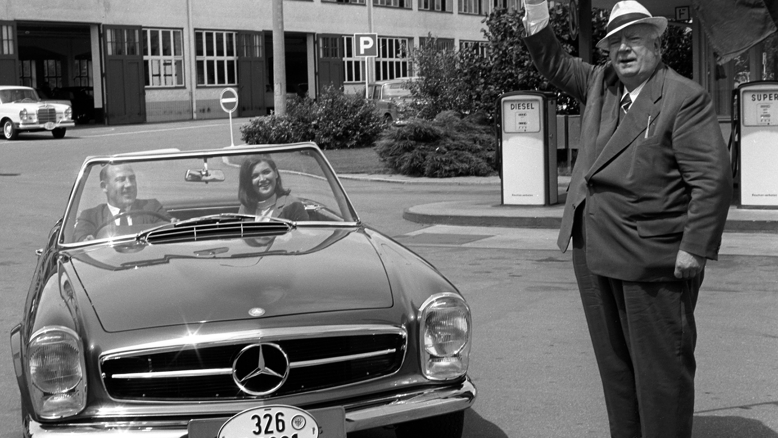 This photo shows Moss collecting his car from the factory, being ‘flagged away’ by Mercedes’ racing team manager Alfred Neubauer, with his second wife, Elaine, in the passenger seat.