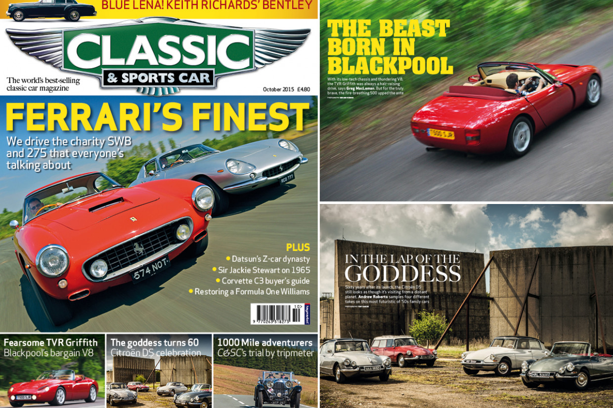 The brand-new issue of Classic & Sports Car goes on sale in the UK today (3 September), and it’s jam-packed with fresh classic content. The headline act is a world exclusive first drive of the Colton Ferraris, followed by a massive Citroën DS group test and a full-throttle drive in TVR’s bargain Griffith 500. We also take a look at Datsun’s Z car dynasty and Keith Richards’ Bentley Blue Lena. We investigate a charismatic Triumph TR4-based Fiberfab Jamaican, while later looking back at the Williams FW13B and the last days of analogue in Formula One.